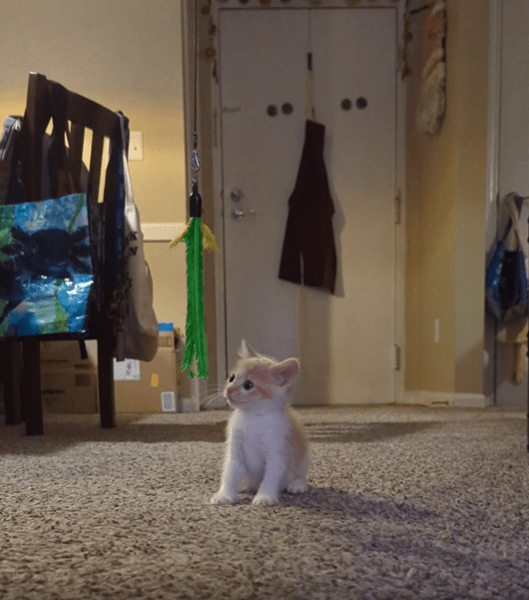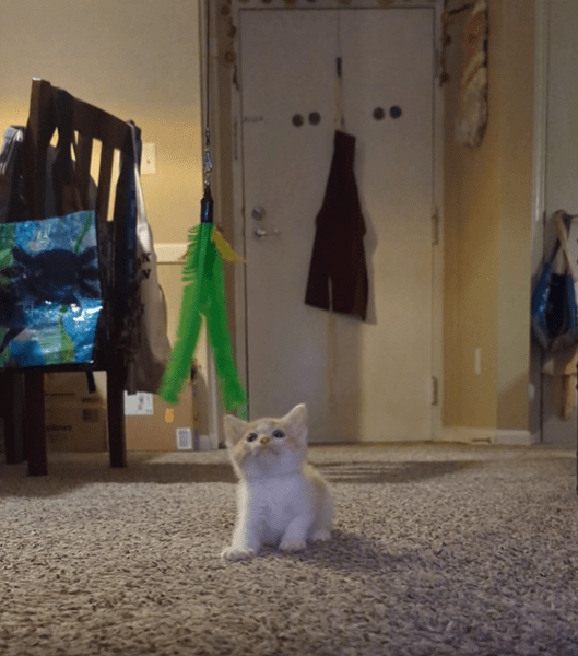 공중에서 살짝 매달린 장난감 하나가 흔들리고 있습니다. 기다란 줄 끝에 달린 깃털과 공은 바람결에 따라 천천히 움직이고, 그 아래, 아직 세상에 익숙해지는 중인 아기 고양이 한 마리가 몸을 낮추고 있습니다.