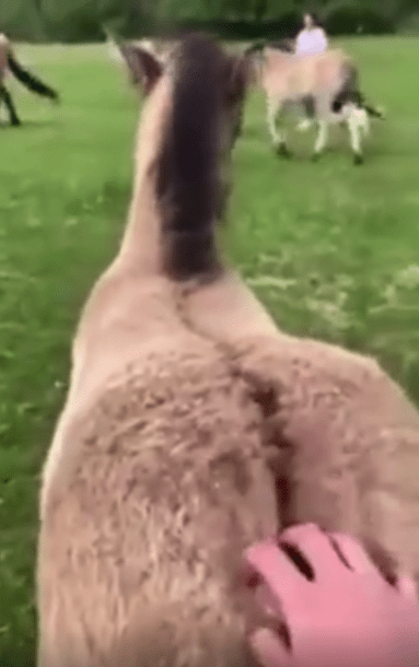 하지만 그 평온한 순간도 아주 짧은 찰나에 바뀝니다. 주인의 손길이 멈추자, 말은 처음엔 그저 가만히 서 있습니다. 그러나 곧, 주인이 한 발 뒤로 물러서며 손을 떼는 순간, 말의 몸이 조금씩 움직입니다. 눈치 보듯 고개를 돌리는 것도 없이, 말은 말없이 한 걸음, 두 걸음 주인 쪽으로 다가옵니다. 그리고는 정확히, 아주 명확하게, 엉덩이를 돌려 주인을 향해 들이밉니다.