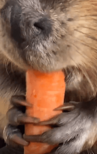 비버의 손은 마치 사람처럼 섬세했어요. 두 손으로 당근을 꼭 쥔 채, 이를 드러내지 않고 앞니로 조용히 파고들었습니다. 한 입 한 입 깨물 때마다 작은 턱이 움찔하고, 입 주변의 털이 살짝살짝 떨리는 모습에선 세심한 집중력이 느껴졌죠. 털복숭이 얼굴 중앙에 자리한 동그란 눈은 아무런 경계심 없이 화면을 향해 열려 있었고, 그 속엔 오로지 '먹는 일' 하나에만 집중하는 순수함이 담겨 있었습니다.