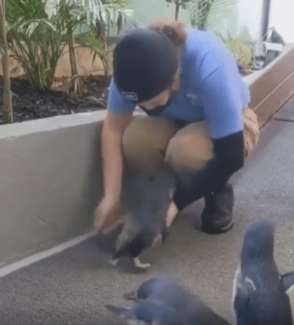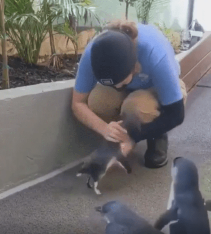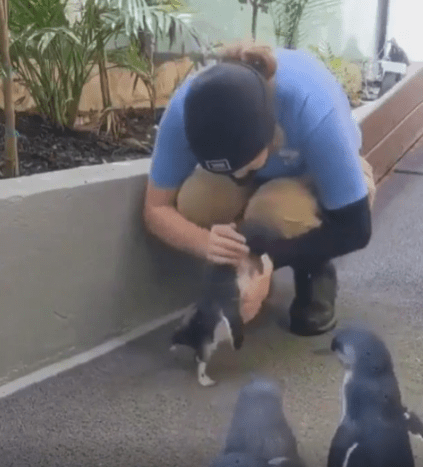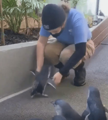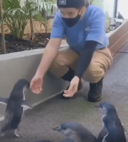차가운 바닥 위, 하얀 털과 검은 등판의 귀여운 펭귄 한 마리가 어딘가를 바라보다가—순간, 눈빛이 달라집니다. 그 시선 너머에서 걸어오는 사람. 바로 펭귄이 가장 좋아하는 인간이었죠. 그리고 그 순간, 마치 버튼이 눌린 듯 펭귄의 반응이 폭발합니다.