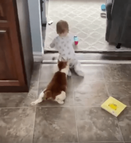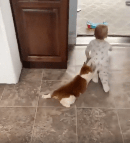 고양이는 바지를 붙잡고 바닥에 납작하게 누운 상태 그대로, 아기가 움직일 때마다 같이 딸려가고 있었습니다. 모양새만 보면 마치 “넌 내 감시 범위 안에 있어야 해”라고 말하는 것 같았죠. 심지어 가끔씩 아기가 멈추면 고양이도 멈추고, 다시 기어가기 시작하면 고양이도 또 끌려가기 시작합니다. 이건 우연이 아니라 의지였습니다. 절대 놓지 않겠다는.