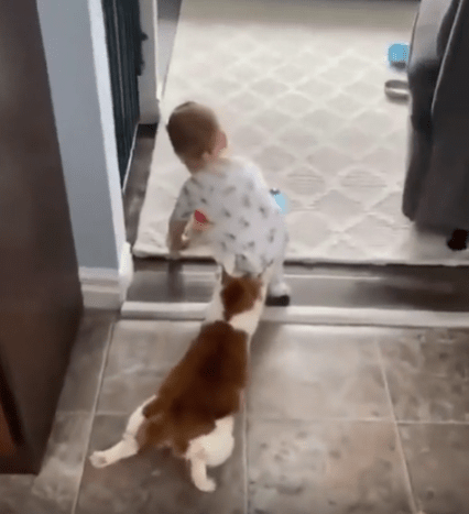 햇살 좋은 어느 집 거실, 아기가 기저귀 바지를 입고 엉금엉금 기어 다니기 시작합니다. 그런데 그 뒤엔 묘하게 처연한 존재가 하나 따라다닙니다. 바로 고양이. 그것도 단순히 ‘따라오는’ 정도가 아니라, 아기의 바짓자락을 앞발로 꼭 붙잡은 채 질질 끌려다니고 있는 모습이었어요.