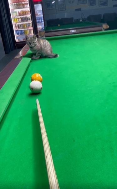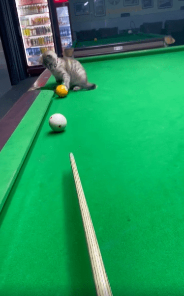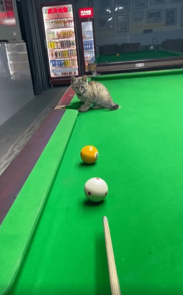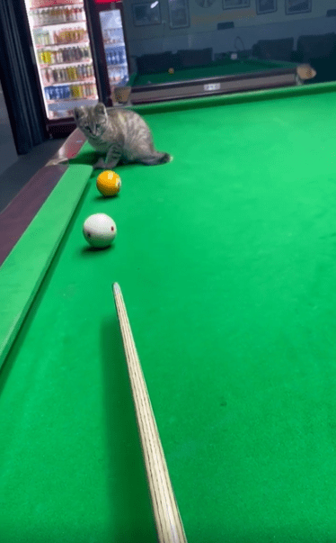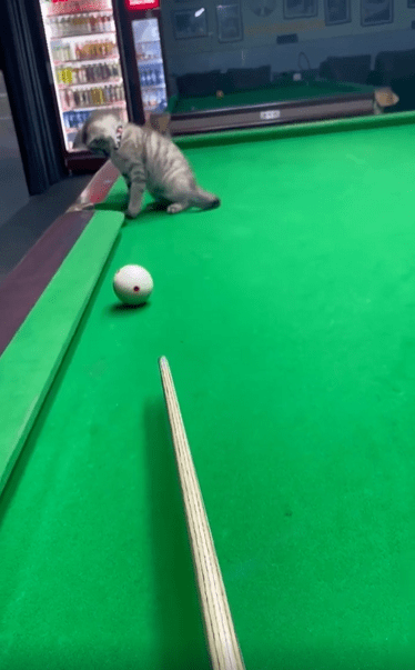 당구대 위, 가만히 앉아 있는 고양이 한 마리. 눈빛은 진지하고, 몸은 구멍 바로 앞에서 바짝 긴장한 듯 모아져 있습니다. 그런데 그때, 주인이 굴린 당구공 하나가 천천히 고양이 쪽으로 다가옵니다. 놀라운 건 그 다음 순간이죠.