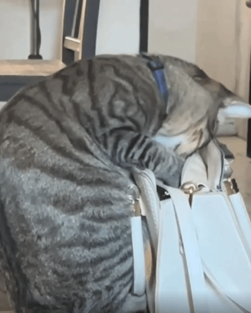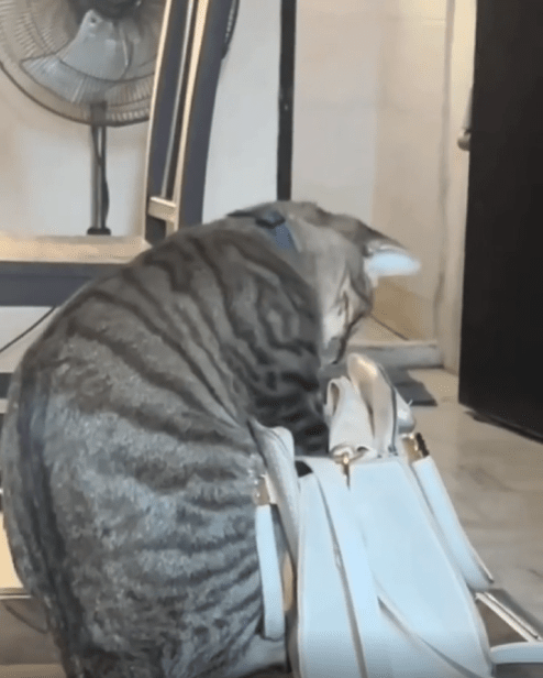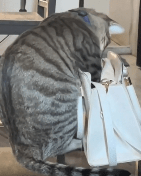 앞발을 깊숙이 넣은 채 핸드백 안을 열심히 헤집고 있는 모습이 어딘가 진지해 보이기까지 합니다. 눈빛은 사냥꾼처럼 집중되어 있고, 몸은 거의 가방 속에 절반쯤 들어가 있습니다. 무언가 중요한 단서를 찾는 듯한 태세죠.