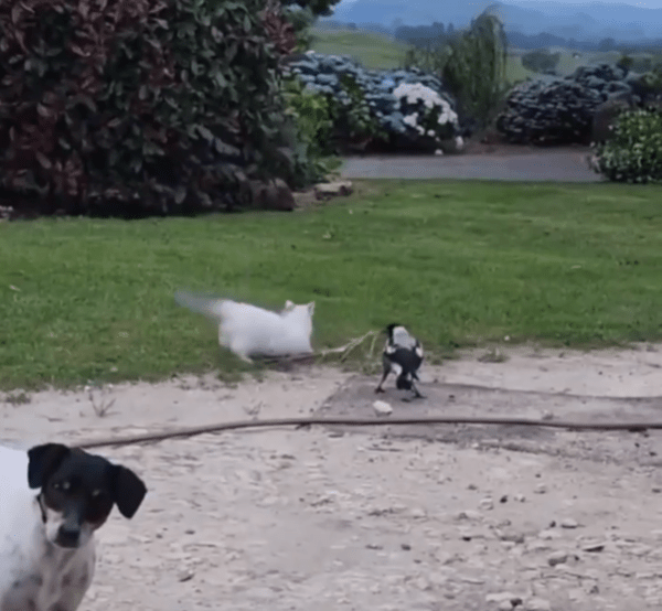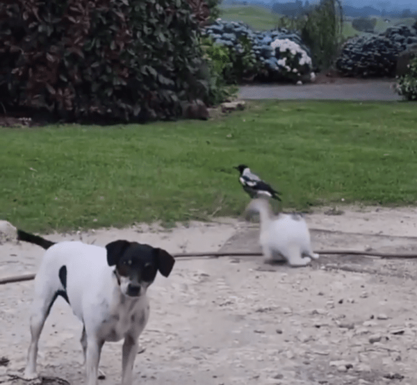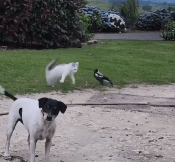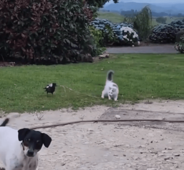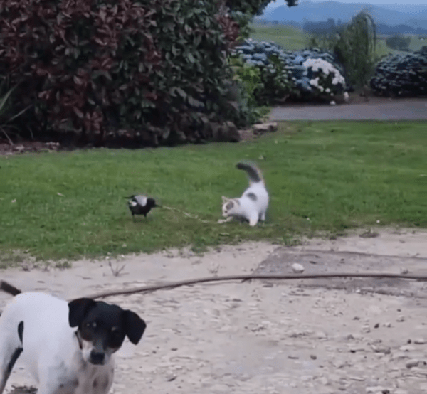 고양이는 여전히 새의 진로를 방해하려는 듯 미묘한 발놀림을 멈추지 않고, 새는 더는 방법이 없는지 잠시 멈춰섰다가 다시 움직입니다. 그리고 화면 구석에선 여전히 꼬리만 살랑살랑 흔들리는 강아지. 이런 독특한 조합이 어쩐지 웃음을 자아냅니다.