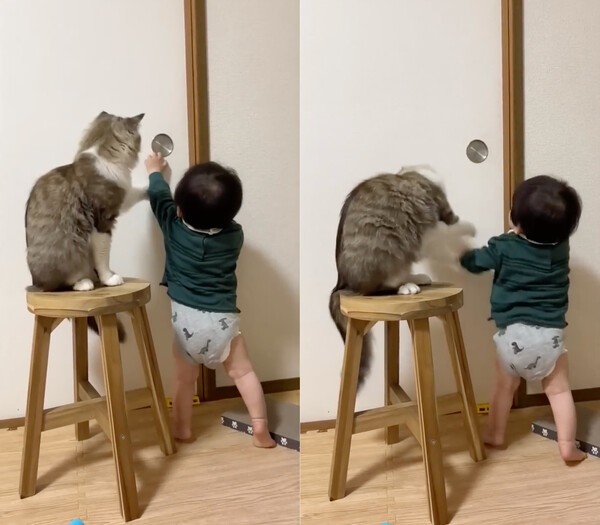 누리꾼들은 이들을 보고 어떤 반응을 보였을까요? "고양이가 엄마 같아.", "아이가 고집이 세네.", "저기에 참치통조림이 얼마나 들어가 있길래 막아서는 걸까?"라며 오히려 고양이 편을 들어주는 듯 했습니다.
