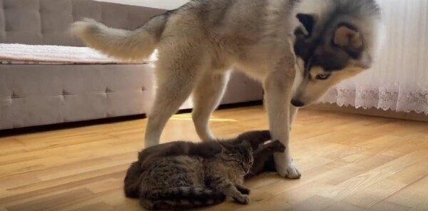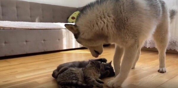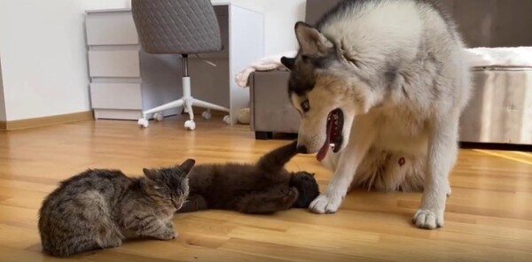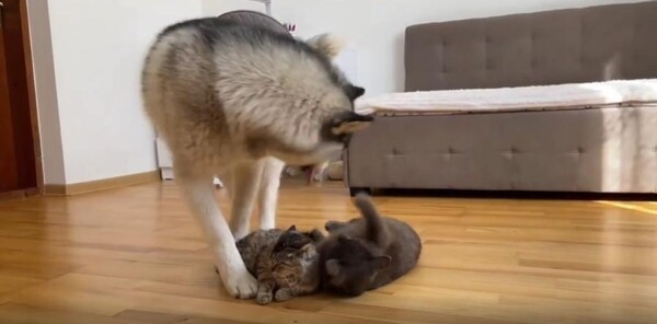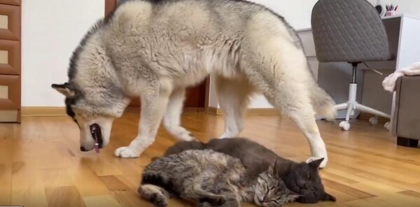 강아지는 앞발로 톡, 다시 한 번 톡. 두 고양이의 몸을 툭툭 건드려 보지만, 고양이들은 꿈나라가 더 좋은지 미동도 없습니다. 한 녀석은 눈을 뜨지도 않고, 다른 한 녀석은 그저 눈꼬리만 슬쩍 치켜뜬 채 다시 고개를 돌립니다. 마치 "그만 좀 귀찮게 해…"라는 듯한 표정이 느껴집니다.