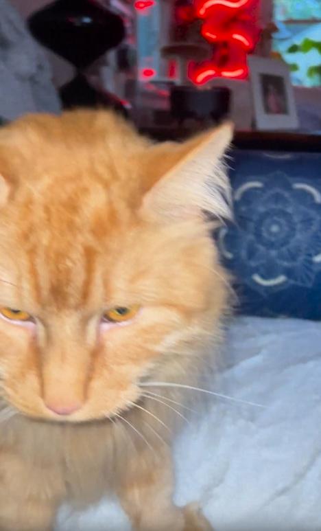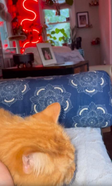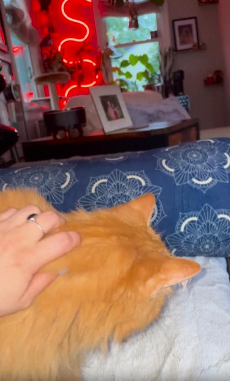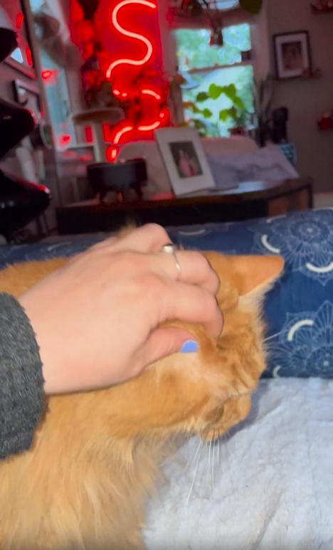영상은 푹신한 침대 위에서 시작됩니다. 그 위엔 따뜻한 오렌지빛 털을 가진 고양이 한 마리가 조용히 앉아 있죠. 눈을 반쯤 감은 채 고요한 분위기를 즐기고 있는 듯한 모습입니다. 그런데 곧 주인의 손이 다가와 조심스레 고양이의 머리를 쓰다듬습니다.
