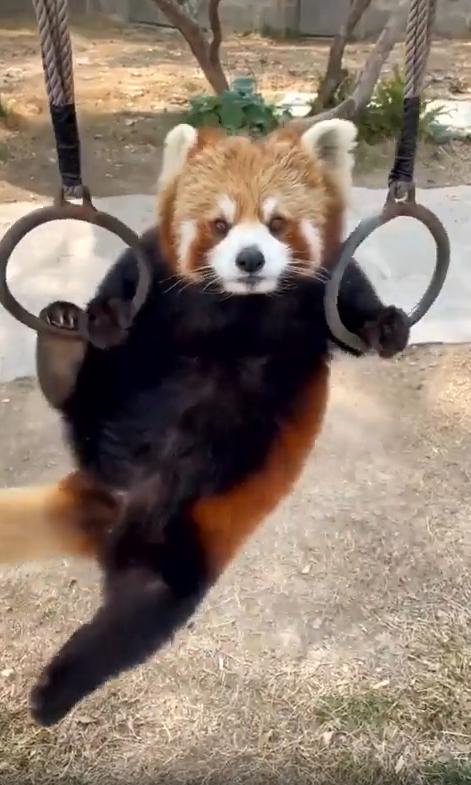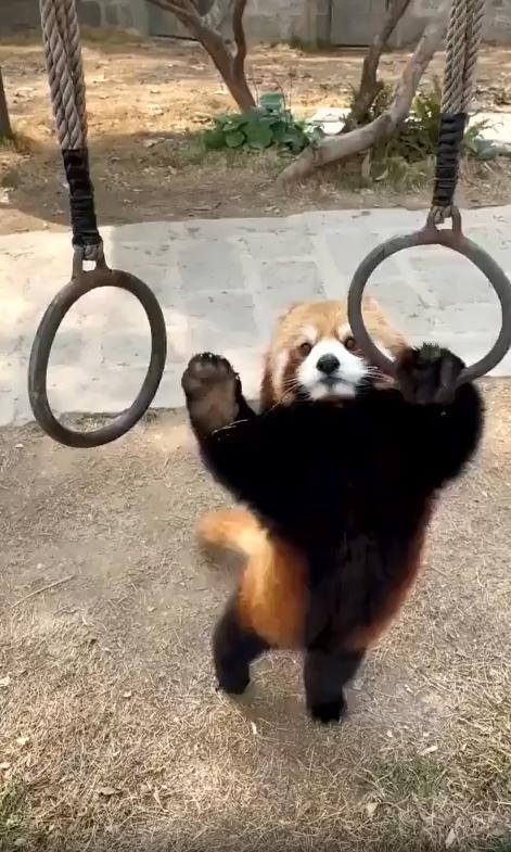 등에 힘이 들어가고, 뒷발은 축 늘어진 채. 레서판다는 몇 번 반복해서 몸을 위로 끌어올리다가 다시 아래로, 그리고 다시 한 번 올라가는 움직임을 보여줍니다. 회전도, 점프도 없지만 묘하게 눈을 뗄 수 없는 장면입니다. 그 작은 팔뚝에 얼마나 힘을 주고 있을까요. 진지하게 링에 매달려 있는 모습에서 어쩐지 운동 중인 우리 모습이 떠오르기도 합니다.