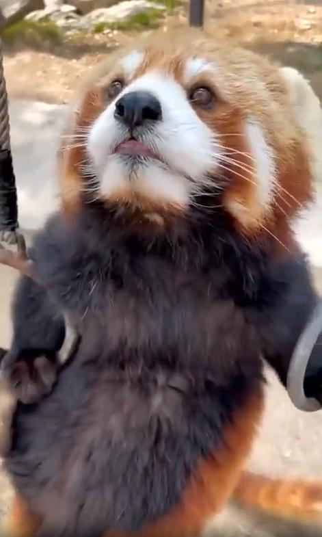 호기심 가득한 눈빛으로 링을 바라보던 레서판다는 앞발을 쭉 뻗어 조심스럽게 링을 움켜쥡니다. 마치 매일 해오던 루틴인 듯 망설임 없이 몸을 들어 올리더니, 어느새 자신의 배 정도 높이까지 올라가 몸을 고정한 채 링 사이를 오르락내리락하기 시작하죠.
