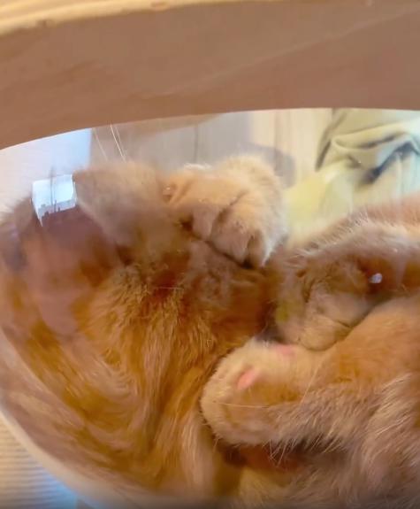 볼의 투명한 곡선 너머로 보이는 고양이의 등과 꼬리는 마치 유리 속 풍경처럼 왜곡되어 보이는데, 그 모습마저 신비롭습니다. 작은 공간에 꼭 맞게 들어가 자신의 온기를 고스란히 전달하고 있는 듯한 그 모습은, 보기만 해도 마음이 따뜻해지는 풍경입니다.
