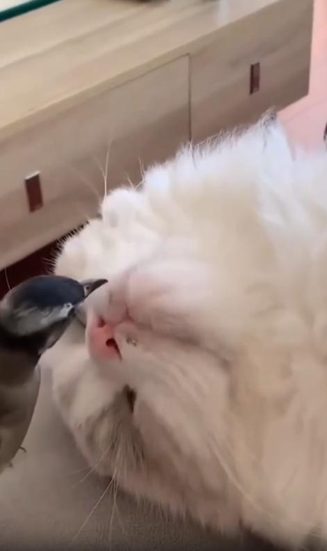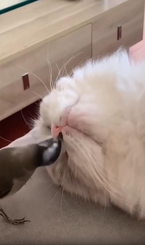 그리고 그 옆, 믿기 힘든 장면이 펼쳐집니다. 작은 새 한 마리가 고양이의 코 주변을 진지한 표정으로 쪼고 있는 겁니다. 콧망울 근처부터 시작해, 콧등, 심지어 콧구멍 주변까지—매우 섬세한 동작으로 조심스럽게 다가갔다가 톡톡. 마치 고양이의 얼굴을 관리해주는 전문가처럼, 작은 부리로 아주 조심스럽게 움직입니다.