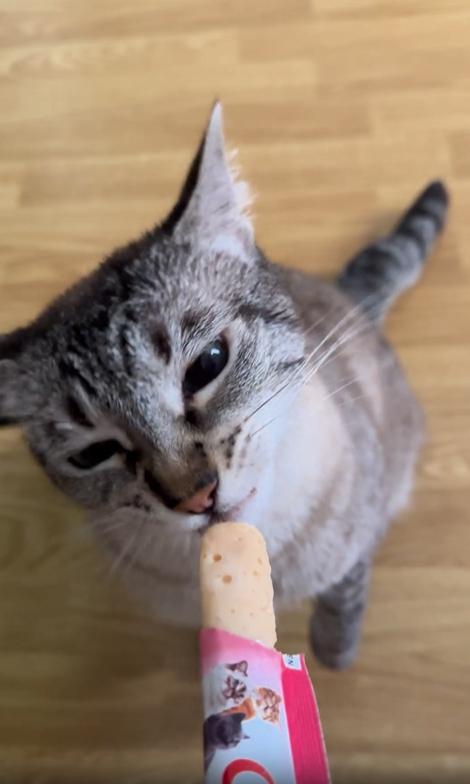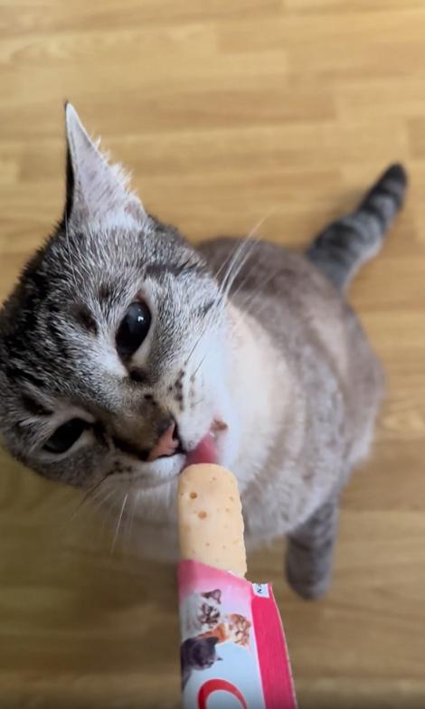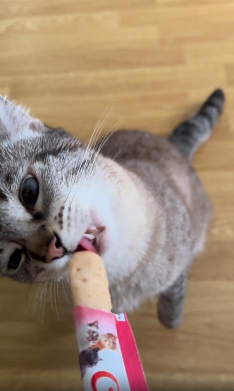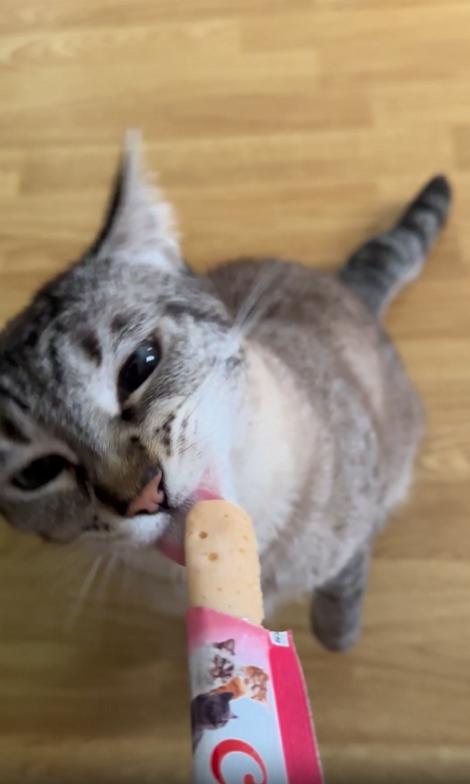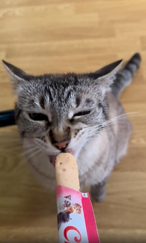 햇살이 따가운 여름날, 바닥에 길게 누운 고양이 한 마리가 주인의 손에 집중합니다. 손끝에는 차갑게 얼린 고양이용 츄르가 달려 있고, 그것이 천천히 고양이의 앞까지 다가오자, 고양이는 지체 없이 혀를 내밀어 핥기 시작합니다. 살짝 감긴 눈, 집중한 듯 모아진 앞발, 그리고 입술 옆으로 살짝 묻은 츄르의 흔적까지—그 모습은 보는 이의 마음마저 시원하게 해 줍니다.