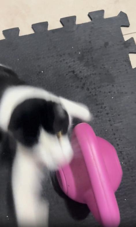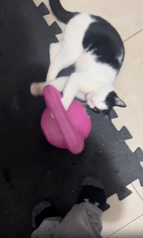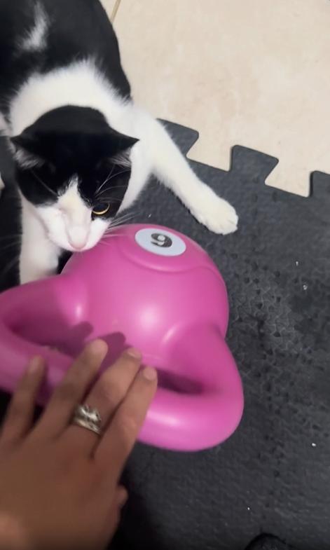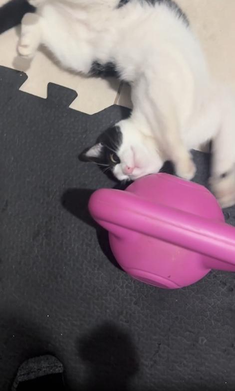 주인이 케틀벨을 잡는 순간, 고양이는 날렵하게 앞발을 뻗어 주인의 손을 툭 건드리고, 가차 없이 연속 공격에 들어갑니다. 등 뒤로 숨었다가 다시 튀어나오는 그 움직임은 마치 게릴라 전술처럼 기민합니다. 주인은 당황한 듯 웃으며 뒤로 물러서지만, 고양이의 기세는 꺾이지 않습니다. 주인의 발을 슬쩍 밟았다가, 다시 손목 쪽을 향해 몸을 낮추고 돌진—한순간도 방심할 수 없는 현장입니다.