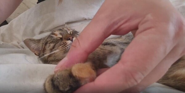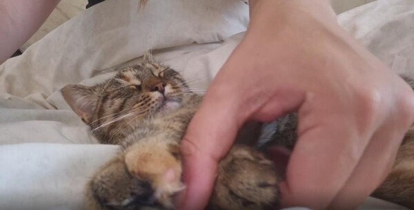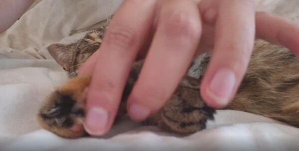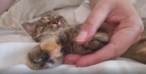 지그시 눈을 감은 채, 작은 고양이는 마치 꿈을 꾸는 듯한 표정이었습니다. 입꼬리가 살짝 올라가고, 귀는 느슨하게 옆으로 향한 채 긴장이 풀려 있었습니다. 마사지를 받을 때마다 살짝살짝 손가락이 움찔이며 반응하는 걸 보면, 이 감촉이 마냥 졸음 속에 묻혀 있는 건 아닌 듯했습니다. 사람의 말로 치자면 “이건… 천국이야” 정도의 만족이겠지요.