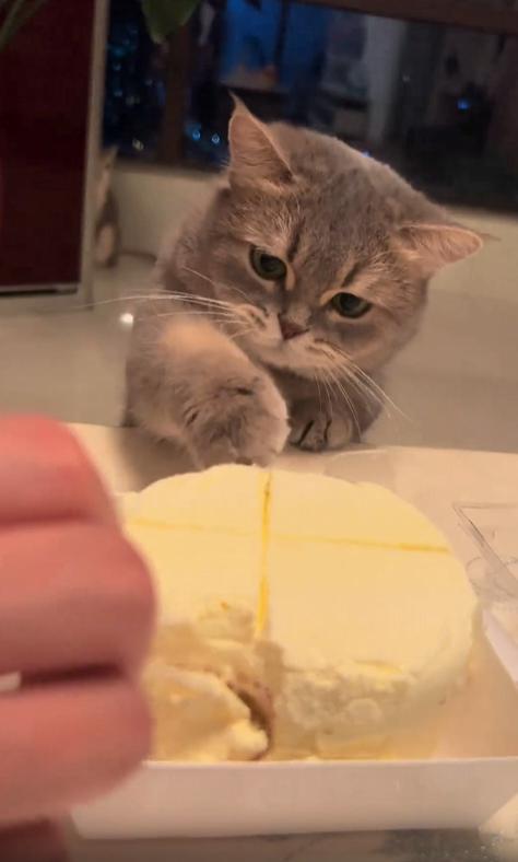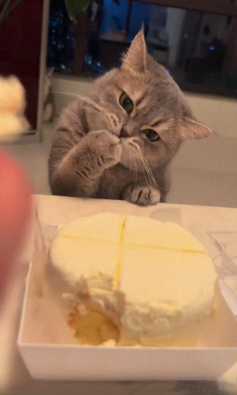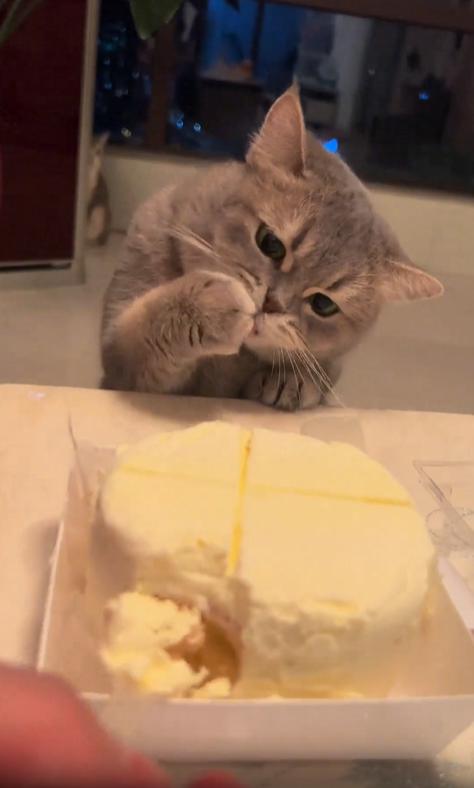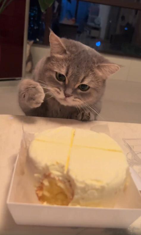 처음엔 살짝 고개만 내밀며 냄새를 맡던 고양이. 이내 앞발을 살그머니 들더니, 망설임도 없이 케이크 위에 콕—! 그 동작엔 주저함이 없습니다. 정확히 크림이 가장 풍부한 부분을 겨냥해 낚아채듯 찍어내는 솜씨는, 마치 미슐랭 셰프의 한 수 같기도 하죠.