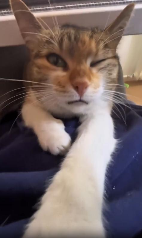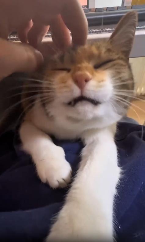 고양이는 주인의 무릎에 몸을 단단히 밀착한 채, 머리만 살짝 내밀고 있습니다. 턱은 무릎에 살짝 얹혀 있고, 눈은 반쯤 감긴 채로 온몸에서 평온함이 흘러나옵니다. 하지만 그 조용한 모습과 달리, 가슴속에서는 ‘웅—’ 하고 낮고 고른 엔진 소리 같은 진동이 끊임없이 울려 퍼지고 있지요.