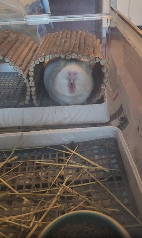 카메라에 잡힌 건 아주 짧고도 포근한 한 장면입니다. 작고 복슬복슬한 기니피그가 입을 한껏 벌린 채 하품을 하고 있죠. 조용한 방 안, 아무 소리도 들리지 않는 듯한 고요함 속에서 기니피그는 작은 몸을 움찔이며 턱을 들고 입을 동그랗게 벌립니다. 그 순간만큼은 시간도 잠시 멈춘 것처럼 보입니다.
