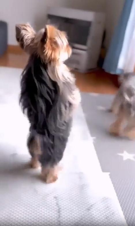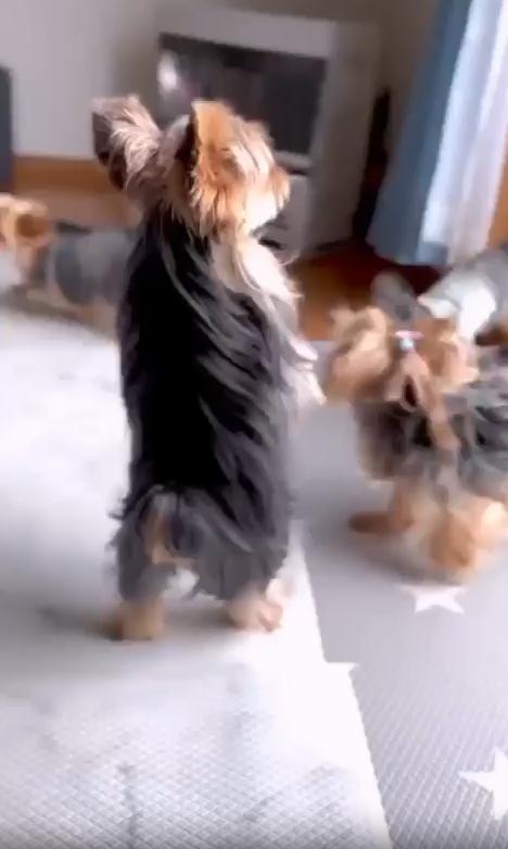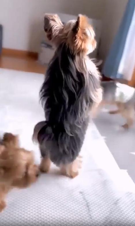 실내 한켠, 강아지들이 자유롭게 어울려 노는 공간. 마치 유치원생들이 모여 신나게 소꿉놀이를 하는 듯한 분위기 속에서 한 마리의 강아지가 시선을 사로잡습니다. 다른 친구들이 장난감을 가지고 이리저리 뛰어다니는 동안, 이 강아지는 갑자기 두 발로 벌떡 일어섭니다. 그리고는 앞발을 살짝 든 채, 몸을 좌우로 실룩실룩 움직이기 시작합니다. 그 모습은 마치 음악이 흐르지도 않는데, 마음속 멜로디에 맞춰 혼자만의 댄스를 추는 듯했습니다.