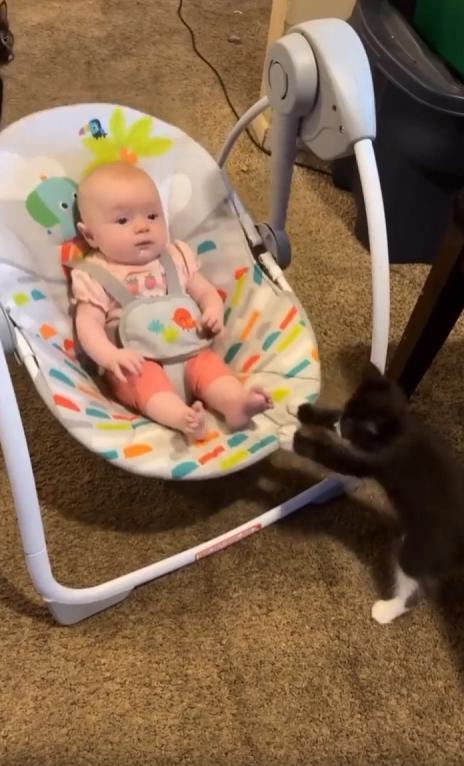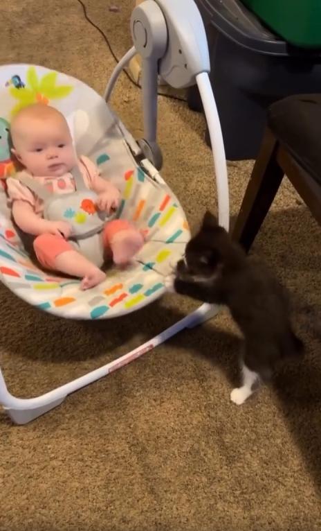 이 모습은 단순한 장난도, 우연한 순간도 아니었습니다. 고양이는 아기를 향한 신기함과 조심스러움을 동시에 품고 있었습니다. 흔들침대가 멈추면 다시 앞으로 다가와, 작게 ‘미는’ 동작을 반복하던 그 모습은 말 그대로 “한 아기가 다른 아기를 도와주는” 장면이었죠.