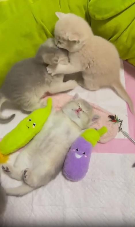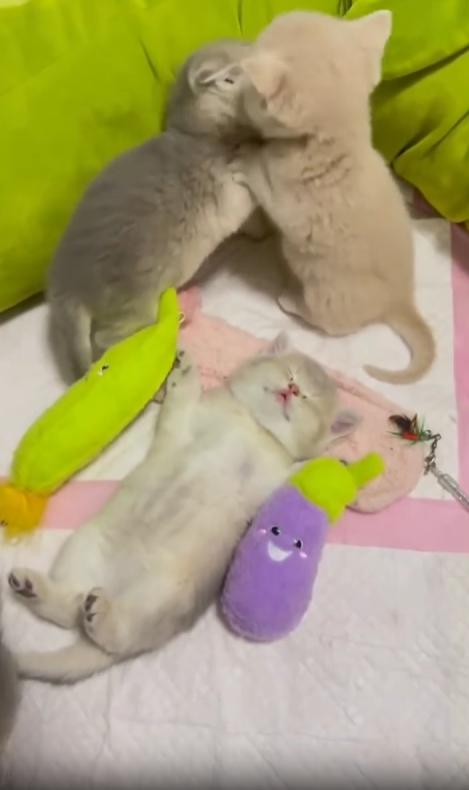 하지만 바로 옆에서는 전혀 다른 세상이 펼쳐지고 있었습니다. 나머지 두 마리가 서로 앞발을 번갈아 휘두르며 티격태격. 작은 이빨을 드러내며 살짝 물기도 하고, 꼬리를 치켜세우며 장난 섞인 몸싸움을 이어갑니다. 한쪽이 밀리면 다시 달려들고, 또 밀리고—마치 작은 고양이 버전의 레슬링 경기가 벌어지고 있었습니다.