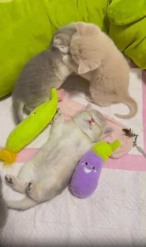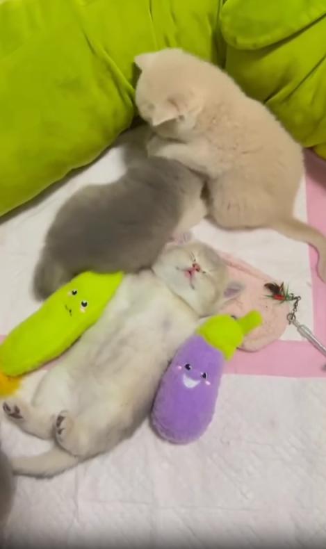 햇살이 드는 방 안, 작은 새끼 고양이 세 마리가 모여 있었습니다. 그중 한 마리는 바닥에 등을 대고, 네 발을 살짝 하늘로 뻗은 채 편안하게 누워 있었죠. 눈은 반쯤 감겨 있고, 배는 숨결에 맞춰 천천히 오르내립니다. 그 표정은 ‘세상일에 관여하지 않겠다’는 듯 무심하고 평온했습니다.