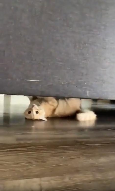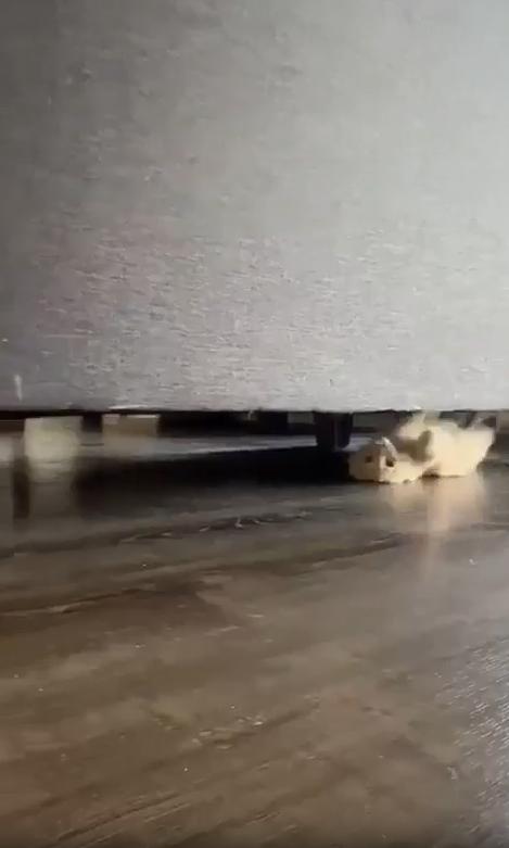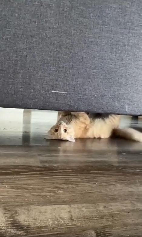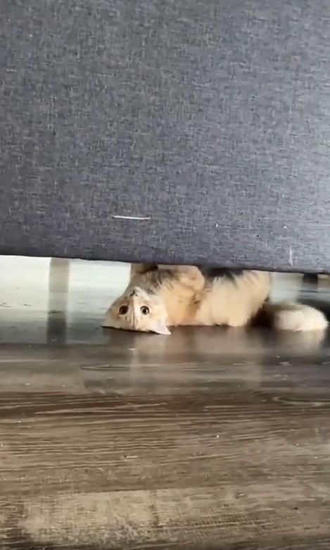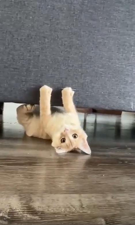 거실 한켠, 소파와 바닥 사이의 좁은 틈새. 그곳에 한 마리 새끼 고양이가 있었습니다. 그런데 자세가 예사롭지 않았죠. 바닥에 등을 대고, 네 발은 위쪽을 향한 채, 마치 거꾸로 매달린 듯한 자세로 소파 밑을 이동하고 있었습니다. 작은 배와 턱이 바닥을 스치고, 네 발은 소파 밑의 구조를 잡으며 조금씩 앞으로 나아갑니다.