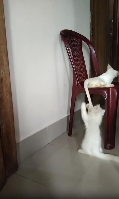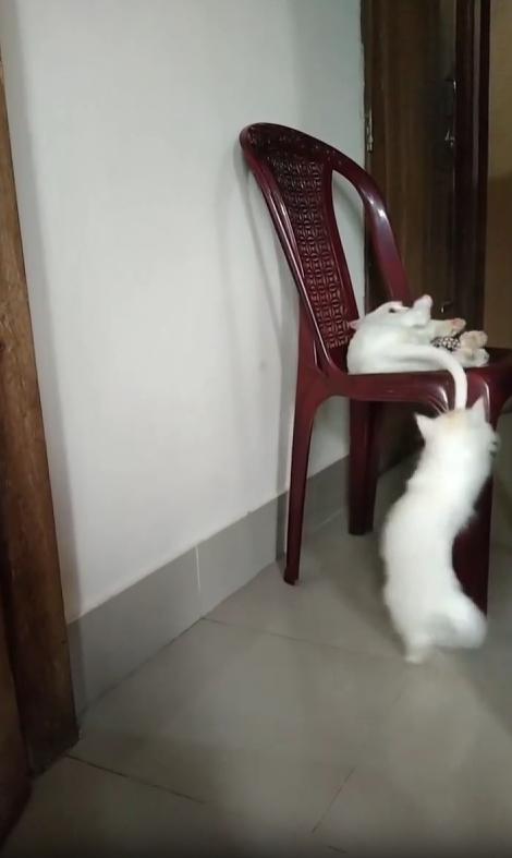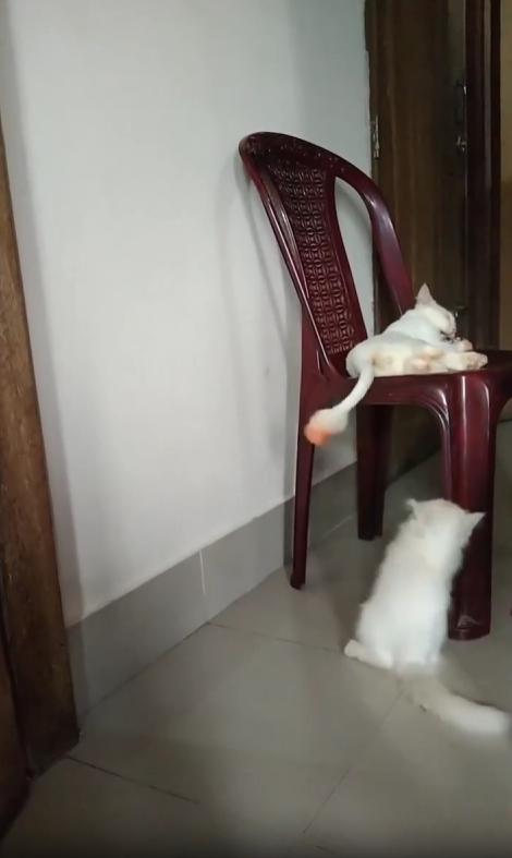 꼬리가 살짝 움직이자, 아래 고양이의 동작은 더욱 재빠르게 변합니다. 이번에는 양발을 동시에 사용해 꼬리를 붙잡으려 하지만, 꼬리는 고양이 위쪽에서 미묘하게 피하며 다시 흔들립니다. 그 모습은 마치 의자 위의 고양이가 ‘잡을 수 있으면 잡아봐’ 하고 여유롭게 놀리는 듯합니다.