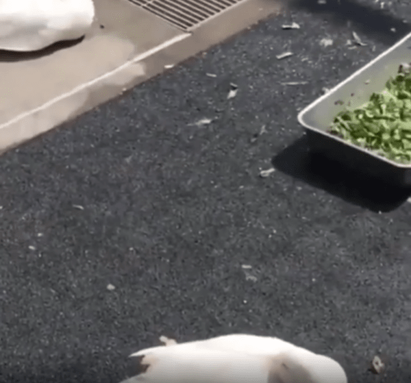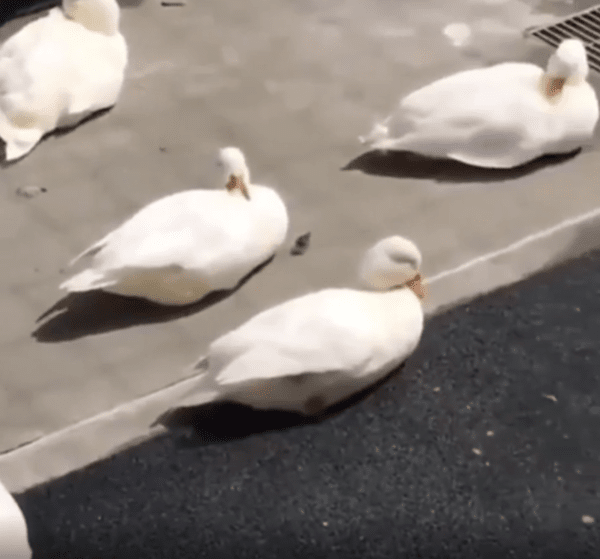 그런데 그중 한 오리는 눈에 띄는 자세로 누워 있습니다. 다른 오리들은 모두 바닥에 앉아 평범한 자세로 쉬고 있지만, 이 오리는 배를 하늘로 향한 채 등을 땅에 대고 완전히 드러누워 있습니다. 다리는 힘이 빠진 듯 살짝 벌어져 있고, 머리는 한쪽으로 기울어져 있습니다. 마치 따뜻한 햇살을 즐기는 듯한 모습입니다.