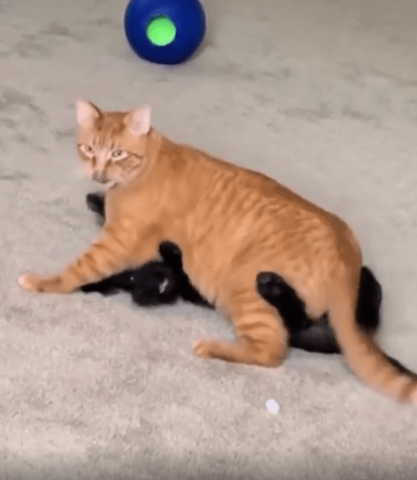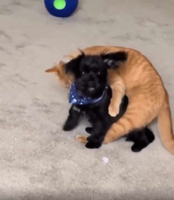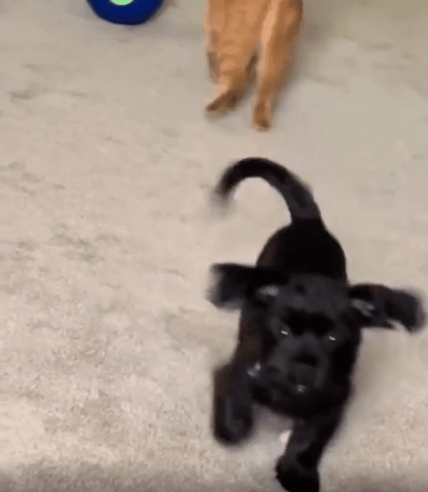 고양이 한 마리가 조용히 검은 개 위에 올라앉아 있었습니다. 마치 원래부터 그 자리가 자기 것인 양 편안하게 자리 잡고 있었습니다. 그리고 이내 고개를 숙이더니 강아지를 부드럽게 핥기 시작했습니다.