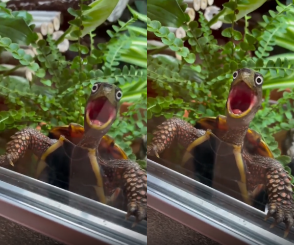 거북이는 이미 깜짝 놀란 표정을 한 채 유리 너머를 바라보고 있었습니다. 마치 무언가 믿을 수 없는 광경을 목격한 듯, 눈을 동그랗게 뜨고 입을 살짝 벌린 모습이었습니다.