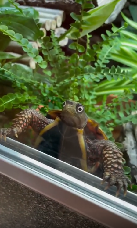 무슨 일인지 이해하려는 듯 잠시 멈춰 있던 거북이는 다시 한 번 유리를 향해 천천히 고개를 내밀었습니다. 하지만 충격은 가시지 않은 듯, 계속해서 놀란 표정을 유지한 채 가만히 있었습니다.