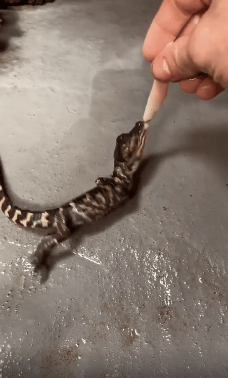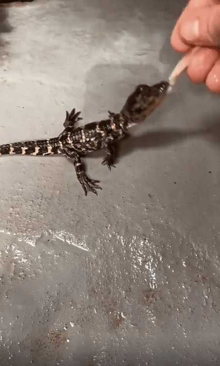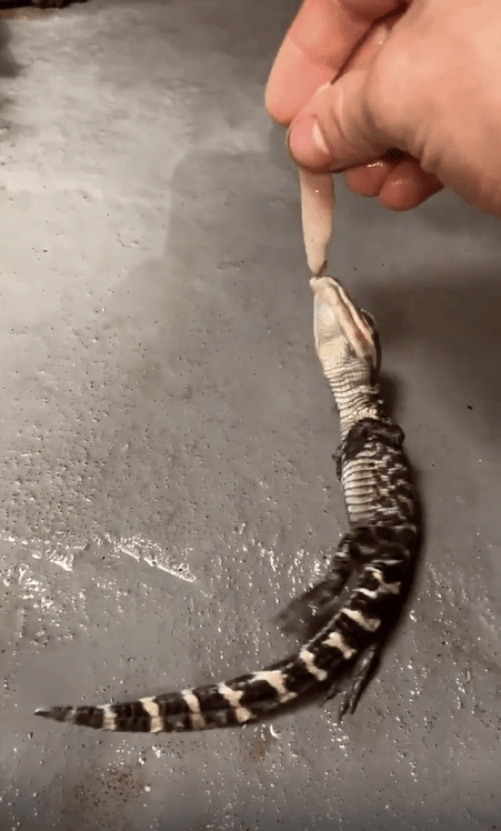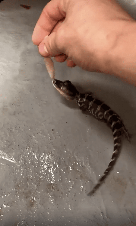 사람 손 위에 작은 새끼 악어가 있었습니다. 크기는 손가락만 한데도, 눈빛만큼은 강렬했습니다. 그리고 그 앞에 먹이가 가까이 다가오자, 새끼 악어는 망설임 없이 입을 벌려 덥석 물었습니다.