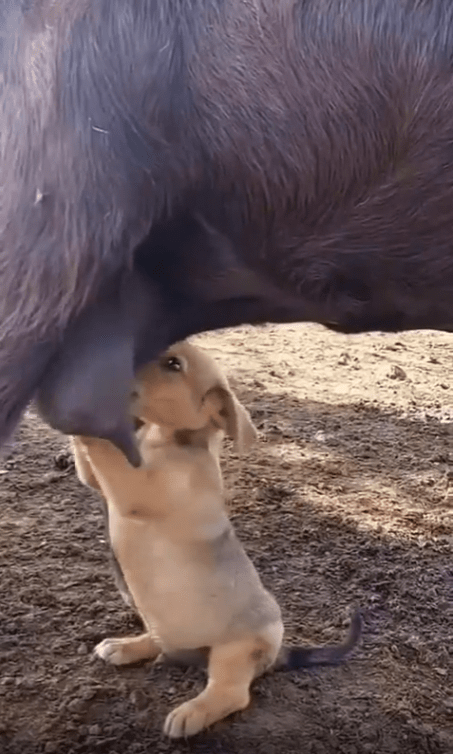 한 마리의 작은 강아지가 염소의 곁에 바짝 다가갔습니다. 그리고 망설임 없이 염소의 젖을 빠는 모습을 보였습니다.